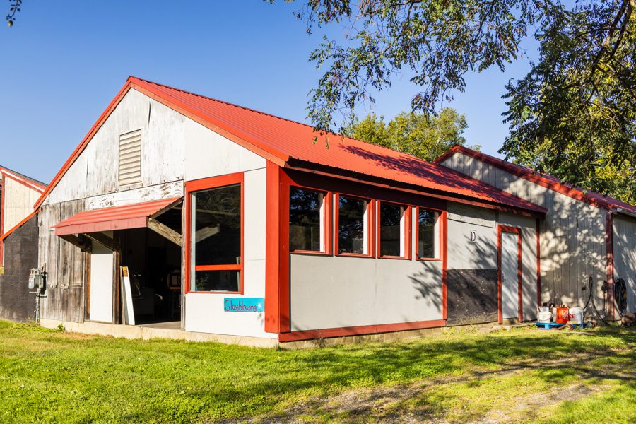 The Glassblowing Studio shares a building with our woodworking studio via separate entrances, and is located between the dorms and the Dining Hall in the Main Building. The building has tall ceilings with a sliding barn door which may be opened to allow for air circulation, and a side area with a coldworking station. Classes in this studio generally have a maximum of 8 students. Browse the gallery below to explore the Glassblowing studio and view a floor plan.